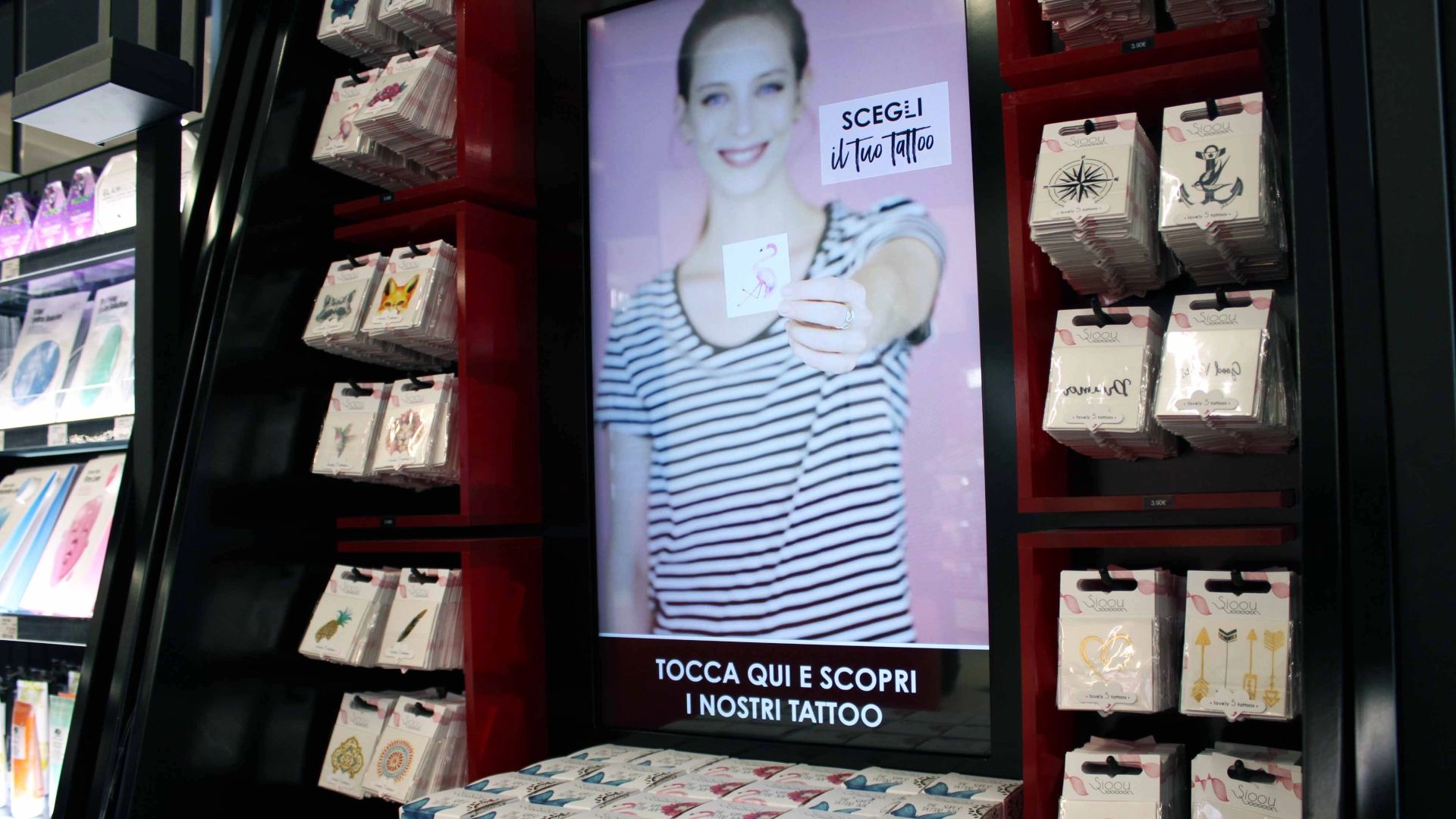 Abbiamo realizzato, infine, un’installazione video per presentare la linea di tattoo temporanei a marchio Sephora. Lo schermo interattivo, posizionato centralmente rispetto agli espositori dei prodotti, mostra ai clienti le varianti di tattoo disponibili. Al tocco di una delle immagini del prodotto, il box contenente il prodotto reale a fianco dello schermo si illumina, mostrando quindi al cliente la sua ubicazione nell’espositore.
