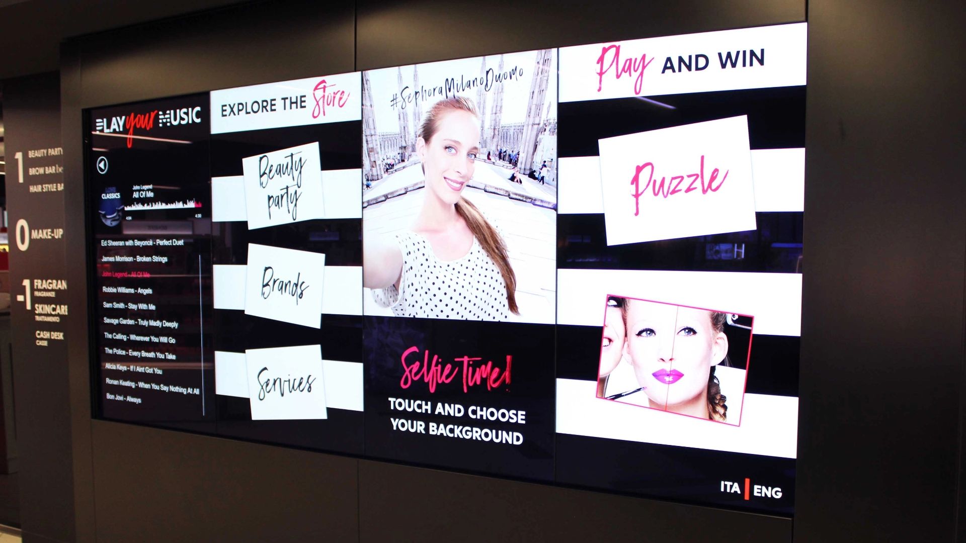 Il Beauty Wall è un insieme di 4 schermi interattivi con i quali il cliente può personalizzare la propria esperienza d’acquisto nello store di Sephora. Sul primo schermo l’utente può selezionare la musica presente in una playlist sempre aggiornata e contenente centinaia di tracce.